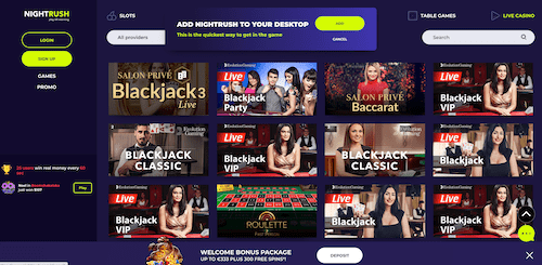 Quando um jogador visita o Nightrush, ele se conecta instantaneamente com o quão bem projetado é e como o tema é incorporado bem. Com suas cores azul marinho exibindo os jogos, os jogadores não terão problemas para encontrar o que querem. Os jogadores também notarão a atração gravitadora que o bônus de boas -vindas terá neles logo após abrir uma conta e fazer seu depósito inicial.