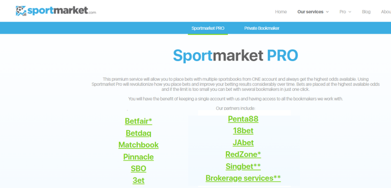 O Sportmarket Pro é uma plataforma de apostas esportivas que oferece acesso a uma dúzia de casas de apostas com as maiores probabilidades e limites. A empresa também oferece várias contas privadas com algumas das maiores casas de apostas e trocas que incluem Matchbook, Betdaq, Maxbet e 18bet. É o favorito entre os jogadores profissionais, pois também oferece cassino ao vivo e uma experiência perfeita para apostar em vários esportes e jogos através de uma conta. Uma outra principal vantagem é que o SportMarket fornece um aplicativo móvel, para que você possa fazer suas apostas em qualquer lugar, a qualquer momento, enquanto estiver em movimento.