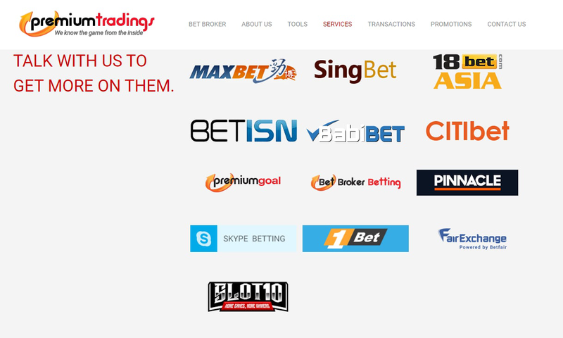 O Premium Tradings é um corretor da BET estabelecido por alguns dos pioneiros das apostas esportivas on -line. Seu objetivo é fornecer um serviço que ofereça as melhores chances e os mais altos limites aos apostadores privados e aos sindicatos. Eles são um dos principais corretores de apostas, com vasta experiência no futebol e nos mercados de handicap asiáticos. Como o BET-IBC, as negociações premium abrem contas com algumas das melhores casas de apostas asiáticas, como Pinnacle, Sbobet, Maxbet e 18Bet, para nomear alguns. Além disso, como o BET-IBC, a plataforma de negociações premium oferece ferramentas de alta qualidade para permitir que os apostadores digitalizem as chances de várias casas de apostas de um local central.