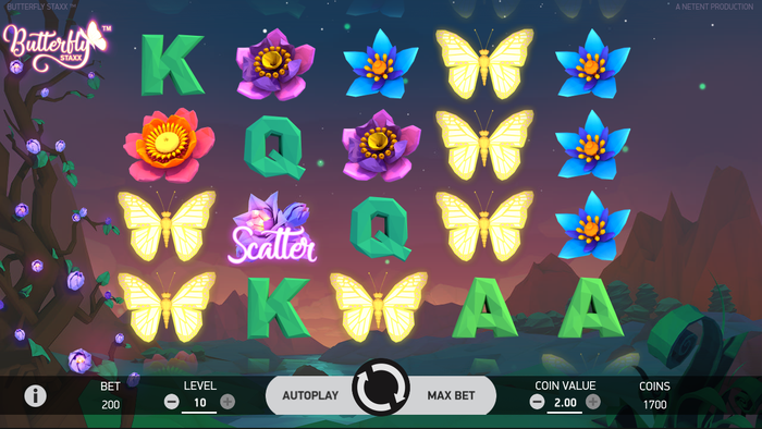 Os rolos consistem em símbolos denominados símbolos de cartas, flores azuis e roxas, flores rosa e amarelo. Os símbolos denominados temáticos são conhecidos por serem altos em termos de pagamento. Você pode estar perguntando o que o Staxx representa no título do jogo; Bem, as borboletas podem aparecer em pilhas cobrindo completamente os rolos. Você também encontrará dois símbolos especiais no jogo, dispersão e selvagem; A flor é o que é usado para representar ambos, mas as rótulos de dispersão e selvagens são visíveis.