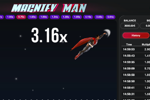 Com um RTP de 96%, o Magnify Man é um incrível jogo de acidente para tentar. É fácil de jogar e oferece pagamentos impressionantes, idealmente 10.000x sua aposta. Do seu design à jogabilidade, tudo é suave e emocionante. Lembre -se, para ganhar; Você precisa clicar em "caixa" antes que o herói voe para longe.