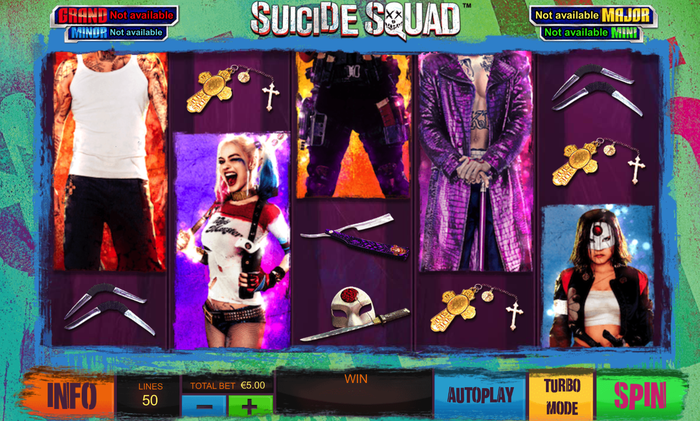 O Suicide Squad é um jogo de slot que possui 50 linhas de pagamento e 5 slots disponíveis para jogar. Os símbolos que são mostrados ao longo do jogo seguem os personagens do filme de esquadrão suicida. Há também um fundo divertido e uma trilha sonora alta para colocar sua cabeça no jogo.